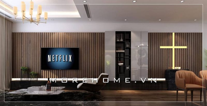 Trong thiết kế nội thất phòng khách chung cư tân cổ điển kết hợp hiện đại, có rất nhiều người lựa chọn ghế sofa làm điểm nhấn trang trí. Ghế sofa vải đem lại sự hài hòa, trang nhã cũng như giá thành hợp lý. Bên cạnh đó, kệ TV cũng là một điểm đáng lưu ý khi trang trí phòng khách. Kệ TV thường được làm bằng gỗ công nghiệp cao cấp An Cường đảm bảo tính bền bỉ và đẹp. Thiết kế mảng tường treo của TV rất ấn tượng với những cái phào nổi đúng chất phong cách tân cổ điển.