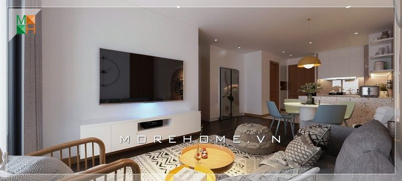 Bố trí nội thất phòng khách liền bếp đẹp cho không gian căn hộ chung cư diện tích nhỏ